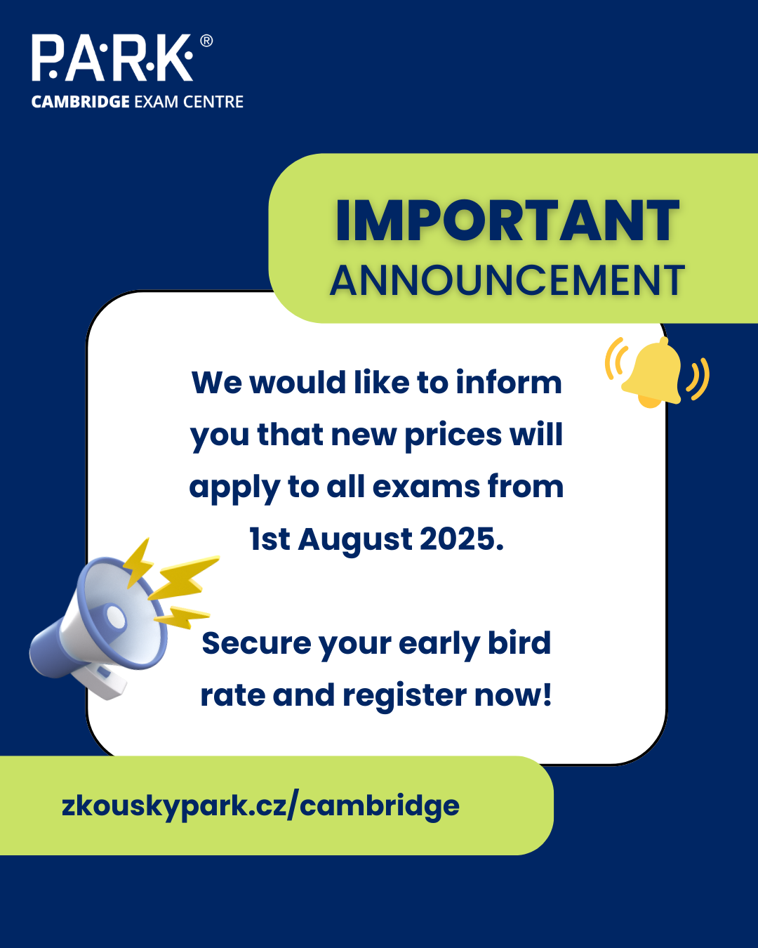 Rádi bychom Vás informovali o skutečnosti, že Cambridge Assessment English představili nové názvy pro jazykové zkoušky. Důvodem je větší přehled o jazykových úrovních CEFR (A1-C2), které byly do názvů zkoušek zakomponovány, např.: FCE zkouška se teď oficiálně nazývá B2 FIRST Upustilo se tedy od používání starých názvů, ale na obsahu zkoušky to nic nemění. Pro Váš lepší přehled jsme staré názvy zkoušek ponechali v závorkách. Více informací najdete na https://www.cambridgeenglish.org/exams-and-tests/qualifications/new-exam-names/Upozornění pro kandidáty: