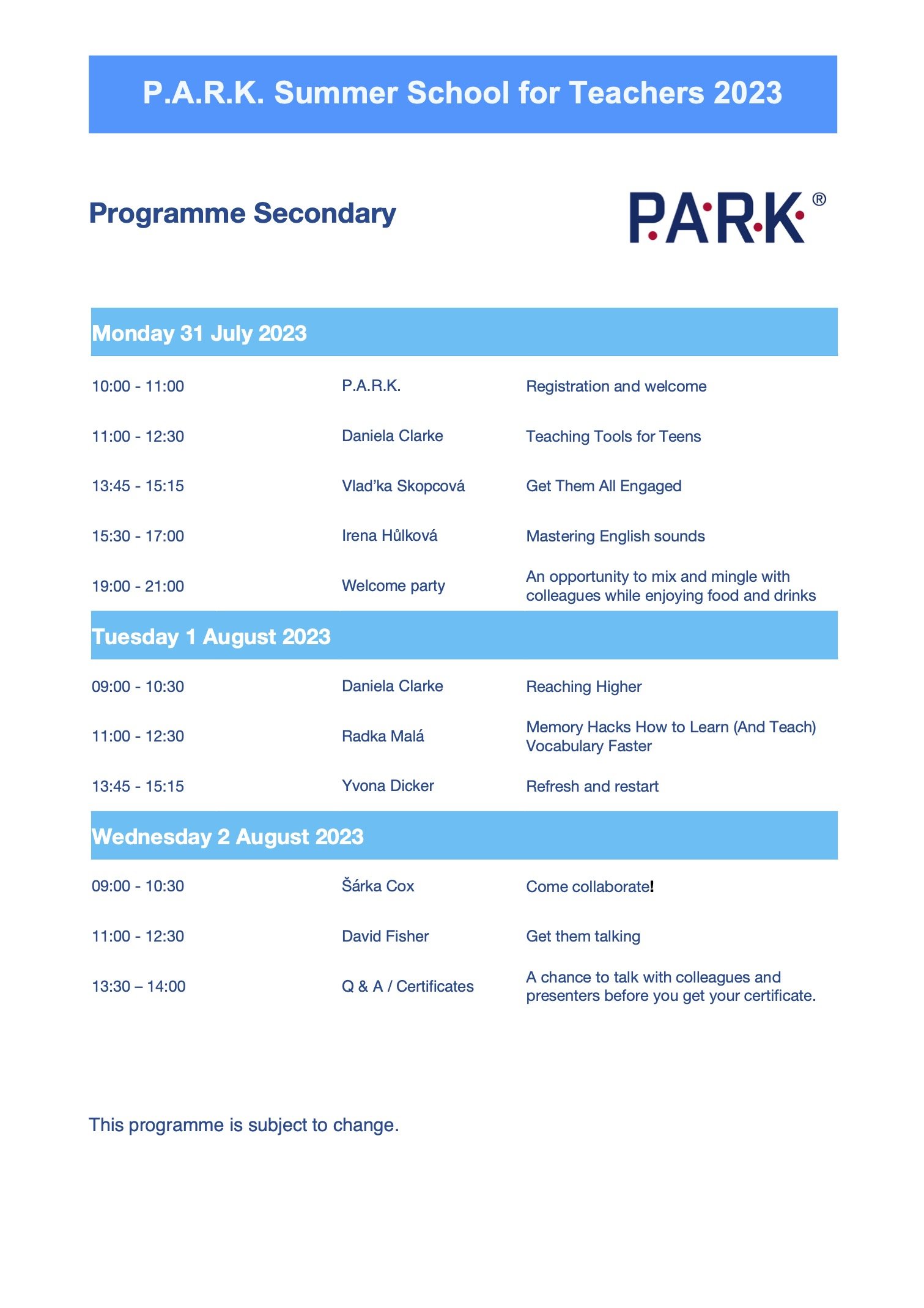 Máme pro vás dva termíny, jeden pro secondary a druhý pro primary teachers, vždy od pondělka do středy na přelomu prázdnin!