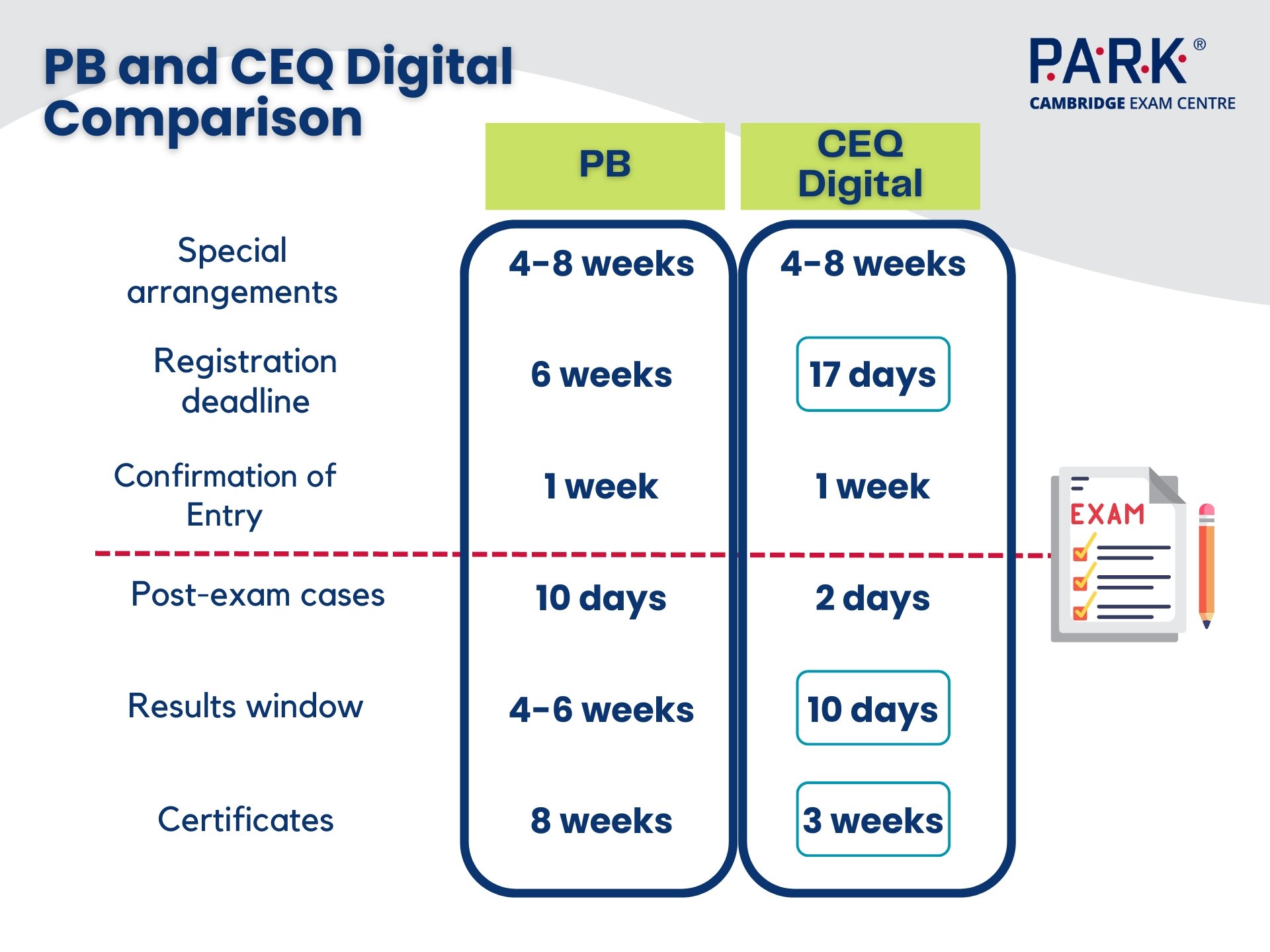 The choice between Paper-Based (PB) and CEQ Digital exams depends on your preferences and needs. Both options offer the same quality and value of the Cambridge English certificate, but each has distinct advantages.